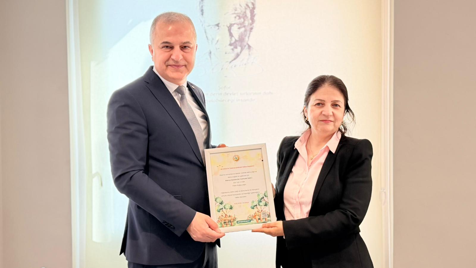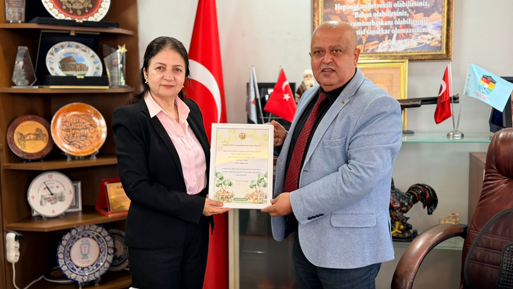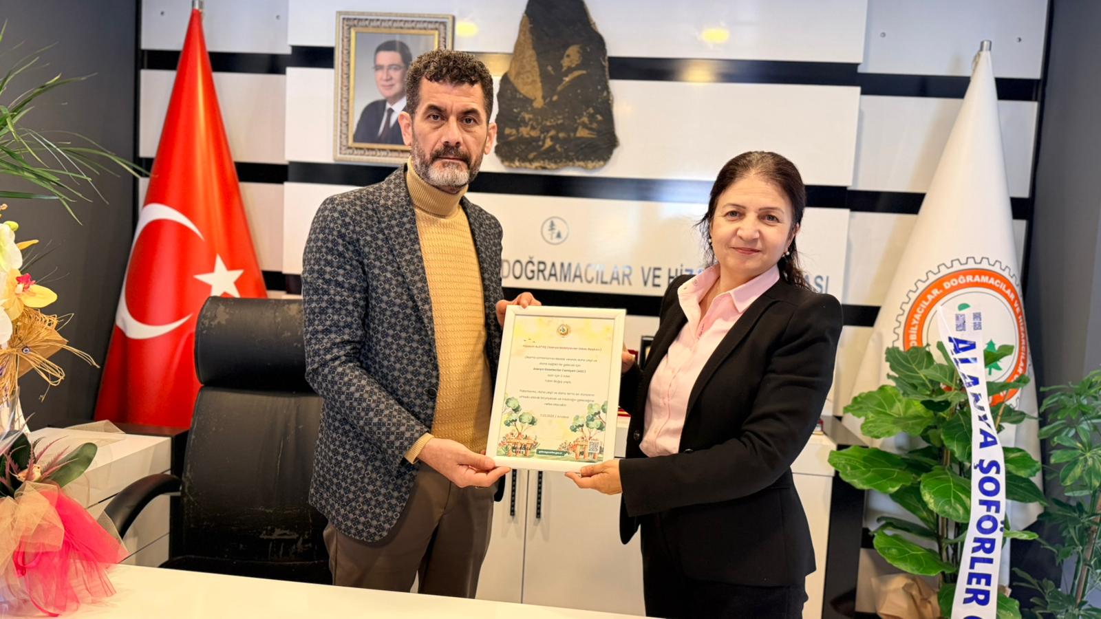 AGC yönetimi ilk olarak Alanya Bakkallar ve Bayiler Odası Başkanlığı’na seçilen Velittin Yenialp’i makamında ziyaret etti. Ardından Alanya Şoförler Odası Başkanı Ali Akkaya ve Alanya Mobilyacılar Odası Başkanı Hüseyin Alataş’a tebrik ziyaretinde bulunan AGC Başkanı Gaye Coşkun ve Yönetim Kurulu üyeleri gündeme dair istişarelerde bulundular. Ziyarette Başkan Coşkun oda başkanlarına, yanan ormanların yeniden yeşertilmesine katkı sağlamak ve sosyal farkındalık oluşturmak amacıyla Orman Genel Müdürlüğü’ne yapılan fidan bağışlarının sertifikasını takdim etti.