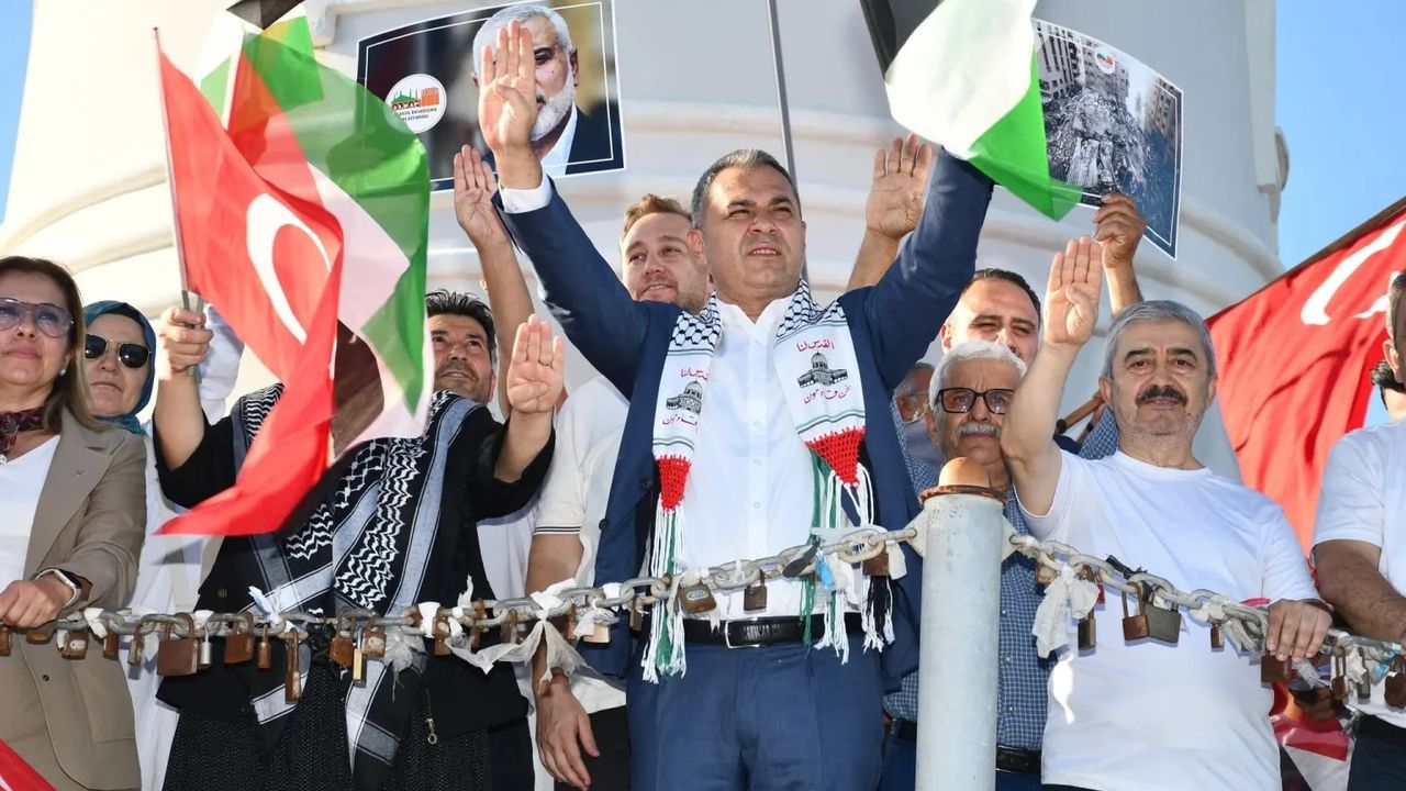 Küresel Sumud Filosu’na destek amacıyla slogan atan vatandaşlar, “Direnişe devam Gazze’ye selam”, “Özgür Filistin” ve “İşgale Son” yazılı dövizler taşıdı.