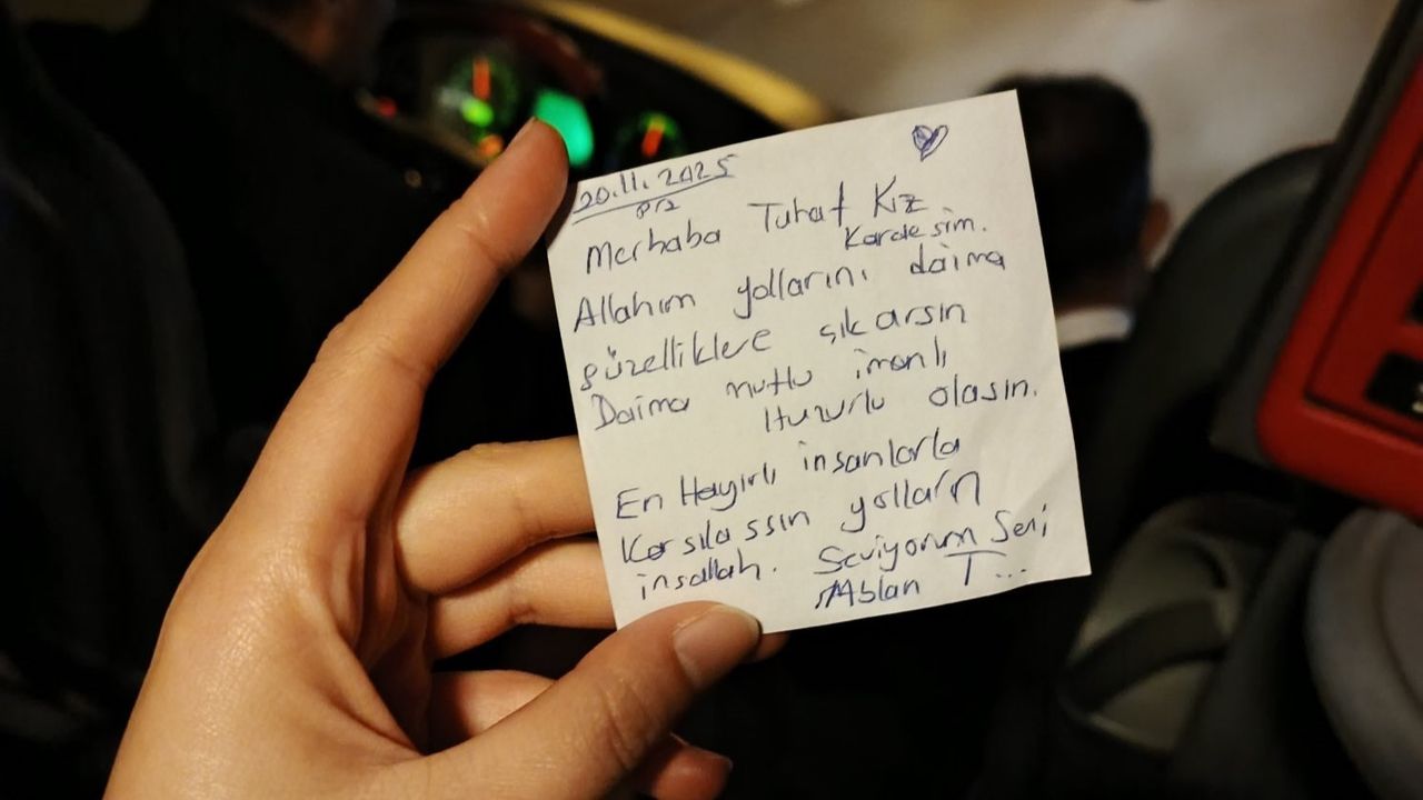 Alanya’da şehirler arası otobüs yolculuğu yapan bir kadın, çantasında bulduğu el yazısı notla duygu dolu anlar yaşadı. 20 Kasım 2025 tarihli notta, "Merhaba Tuhaf Kız Kardeşim" hitabıyla başlayan ve "Allah’ım yollarını daima güzelliklere çıkarsın" duasıyla devam eden samimi satırlar dikkat çekti.
