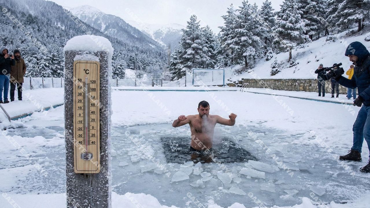 Alanya’nın yüksek kesimlerinde dondurucu soğuklar hakimken, Soğukpınar Yaylası’ndan gelen görüntüler izleyenlerin içini titretti. Hava sıcaklığının -10 dereceye kadar düştüğü yaylada, bir vatandaş yüzeyi tamamen buz tutan havuza girerek adeta soğuğa meydan okudu.