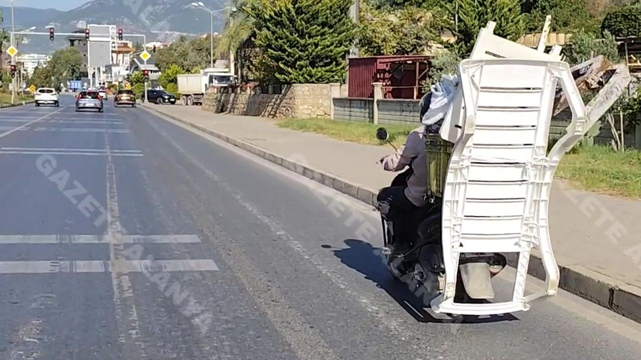 Alanya trafiğinin en işlek noktalarından biri olan D-400 karayolunda bugün ilginç ve bir o kadar da tehlikeli anlar yaşandı. Kimliği henüz belirlenemeyen bir motosiklet sürücüsü, şezlongu motosikletinin arkasına dikey bir şekilde bağlayarak trafiğe çıktı.