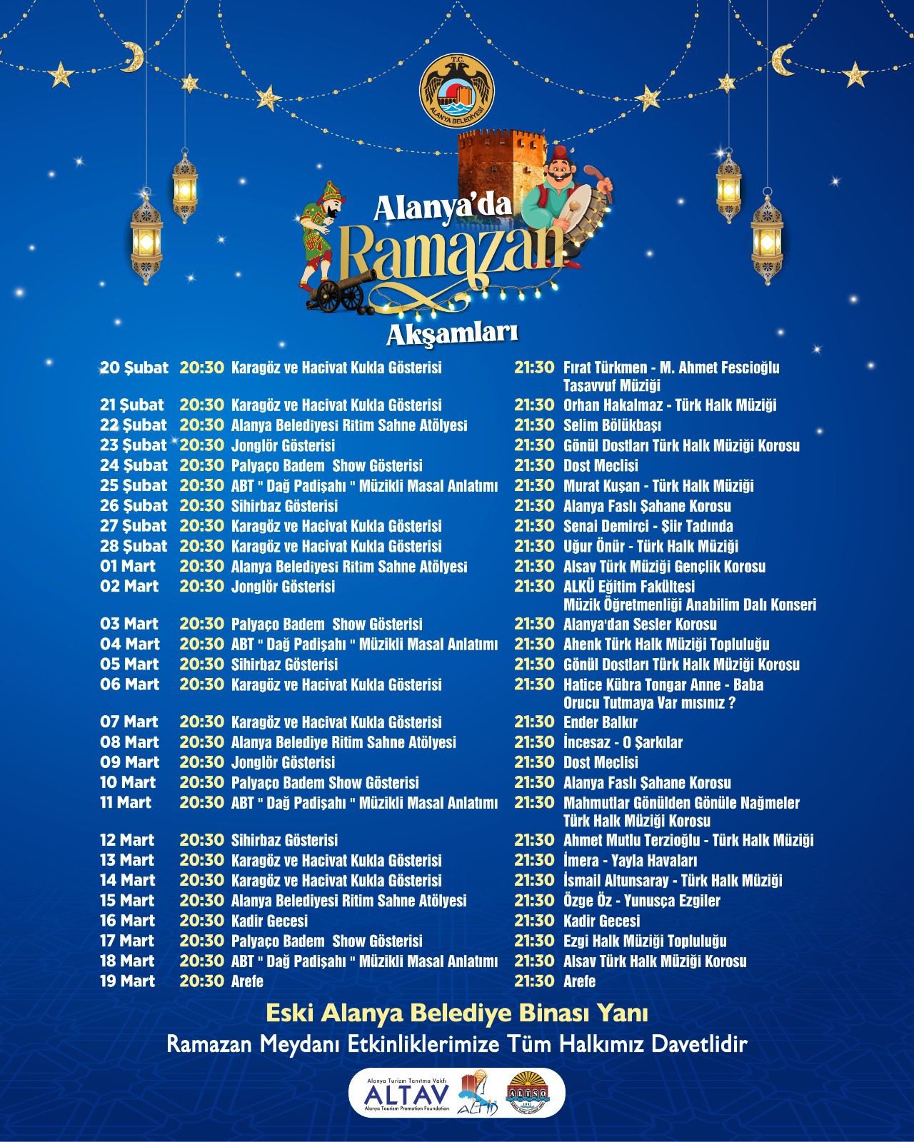 Ramazan Meydanı’nda her hafta farklı sanatçılar sahne alarak, müzik ve şiir dinletileriyle Ramazan akşamlarına renk katacak. 20 Şubat’ta gerçekleşecek açılış programında Fırat Türkmen ve Ahmet Fescioğlu’nun Tasavvuf Müziği dinletisi yer alacak. 21 Şubat’ta Orhan Hakalmaz, 22 Şubat’ta Selim Bölükbaşı, 27 Şubat’ta Senai Demirci, 28 Şubat’ta Uğur Önür, 6 Mart’ta Hatice Kübra Tongar, 7 Mart’ta Ender Balkır, 8 Mart’ta İncesaz, 13 Mart’ta İmera, 14 Mart’ta İsmail Altunsaray, 15 Mart’ta Özge Öz vatandaşlarla bir araya gelecek. Ayrıca Ramazan Ayı boyunca yerel sanatçılar ve müzik gruplarından Murat Kuşan, Ahmet Mutlu Terzioğlu, Gönül Dostları Türk Halk Müziği Korosu, Dost Meclisi, Alanya Faslı Şahane Korosu, ALSAV Türk Müziği Gençlik Korosu, ALKÜ Eğitim Fakültesi Müzik Öğretmenliği Anabilim Dalı Konseri, Alanya’dan Sesler Korosu, Ahenk Türk Halk Müziği Topluluğu, Mahmutlar Gönülden Gönüle Nağmeler Türk Halk Müziği Konseri, Ezgi Halk Müziği Topluluğu ve ALSAV Türk Halk Müziği Korosu, Ramazan Meydanı’nda unutulmaz müzik dinletilerine imza atacak.