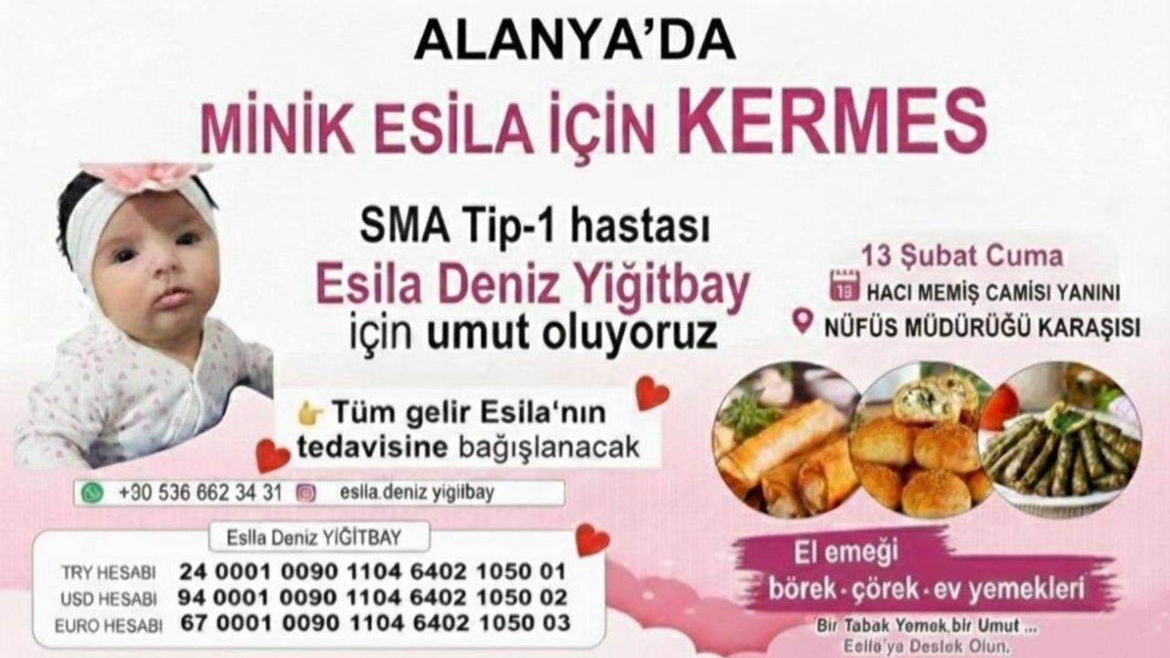 Alanya’da topuk kanı alındıktan sonra SMA Tip 1 hastalığı teşhisi konulan 6 aylık Esila Deniz Yiğitbay, tedavi masrafları için Alanya halkından destek bekliyor. 7 aylık olana kadar tedavi olması gereken Esila’nın tedavi masraflarına destek amaçlı 13 Şubat Cuma günü, Alanya Nüfus Müdürlüğü karşısındaki Hacı Memişler Cami önünde kermes düzenlenecek.