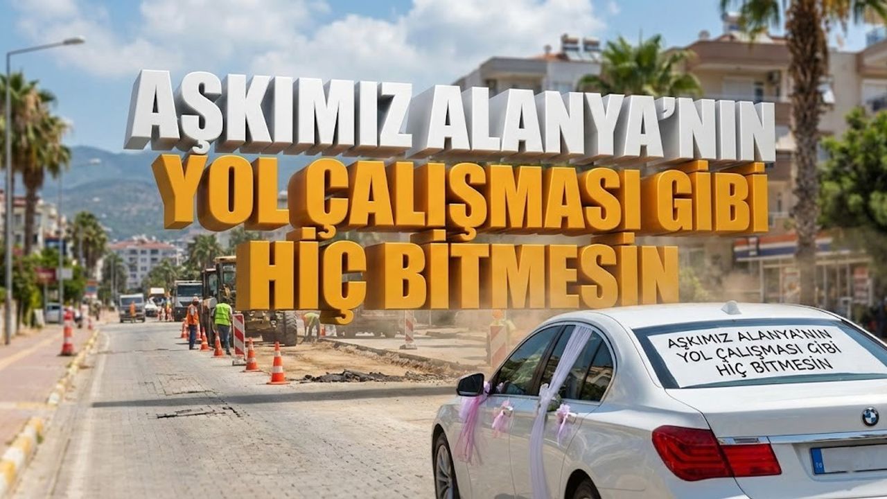 Alanya sokaklarında görüntülenen bir düğün konvoyu, gelin arabasının arkasındaki yaratıcı ve manidar mesajla tüm dikkatleri üzerine çekti. Trafikte seyreden 34 plakalı aracın arka camına yazılan yazı, ilçedeki sürücülerin ortak çilesi olan yol çalışmalarına esprili bir gönderme yaptı.