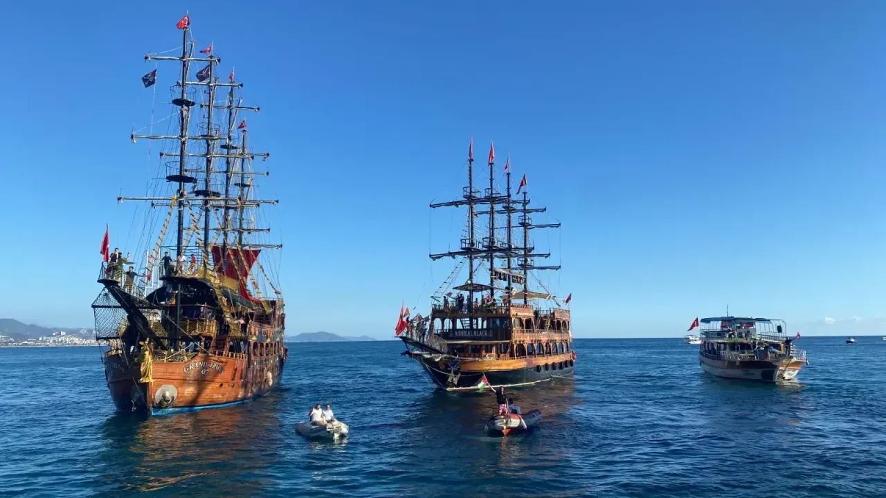 Alanya İskelesi'nden ayrılan çok sayıda tur teknesi, Filistin bayrakları ve siren sesleri eşliğinde denize açılarak Alanya açıklarında tur attı ve dayanışma mesajı gönderdi.