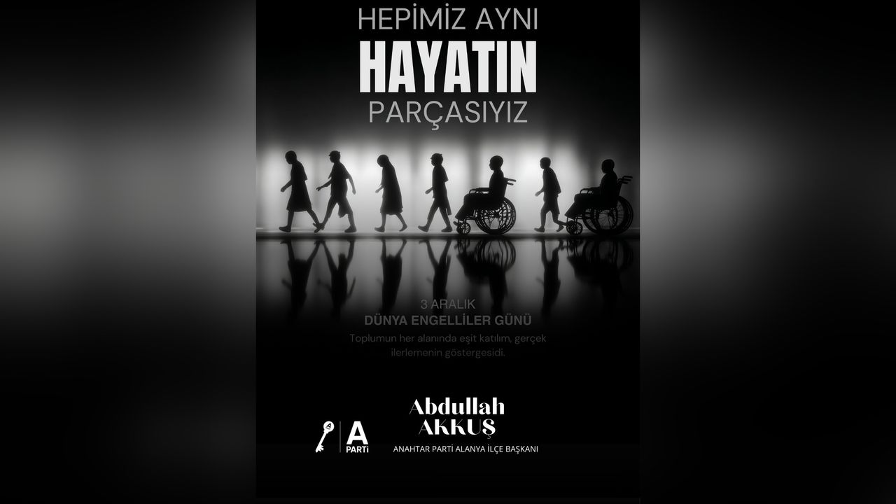 3 Aralık Dünya Engelliler Günü'nün, engelli bireylerin toplumsal yaşamın her alanında eşit, erişilebilir ve özgür bir şekilde var olabilmeleri için farkındalığın artırıldığı önemli bir gün olduğunu belirten Anahtar Parti Alanya İlçe Başkanı Abdullah Akkuş, mesajında şu ifadelere yer verdi: