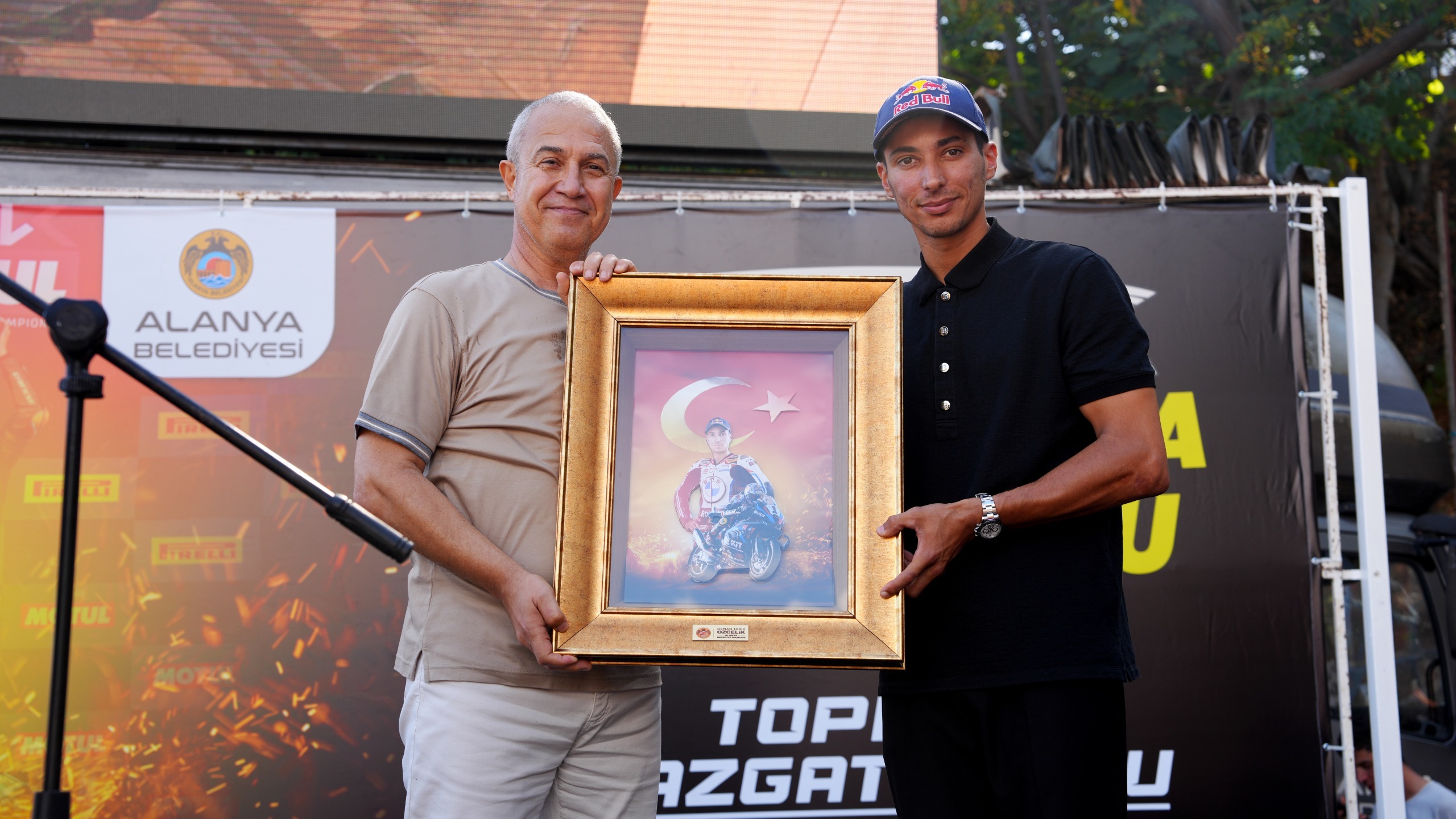 Şampiyon motosikletçi, Alanya Belediyesi’nin öncülüğünde düzenlenen organizasyonla kent girişindeki lunapark arkasında motosiklet kulüpleri üyeleri ve vatandaşlardan oluşan kalabalık bir konvoyla karşılandı. Kilometrelerce uzunluktaki konvoy, İlçe Emniyet Müdürlüğü trafik polislerinin ve Zabıta Müdürlüğü ekiplerinin koordinesinde yola çıktı. Çevre Yolu ve Atatürk Caddesi üzerinden İskele Şelale Meydanına kadar konvoy sürerken, vatandaşlar da yol kenarlarında Türk bayrakları ve alkışlarla bu coşkuya ortak oldular. Törene, Alanya Belediye Başkanı Osman Tarık Özçelik, Alanyaspor Kulüp Başkanı Hasan Çavuşoğlu, Belediye Başkan Danışmanı Sadık Dizdaroğlu, Belediye Meclis Üyeleri ve vatandaşlar katıldı. Alkışlarla karşılanan dünya şampiyonu milli motosikletçiyi Alanya halkı adeta bağrına basarken, vatandaşlar Razgatlıoğlu ile fotoğraf çektirdi ve kasklarını imzalattılar.