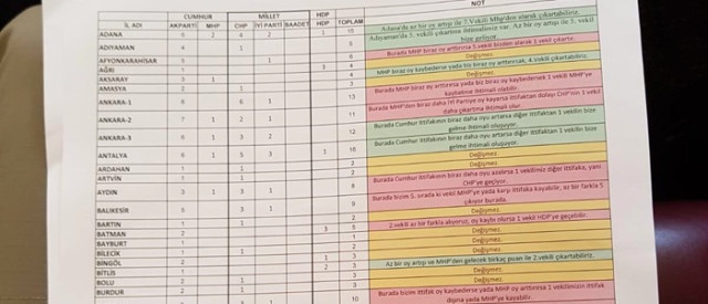Erdoğan'ın masasındaki ankette AKP, CHP, MHP, İYİ Parti ve HDP oy oranları ve milletvekili sayıları il il listelenmiş. Buna göre 24 Haziran'da partiler bakın kaç milletvekili çıkarıyor.