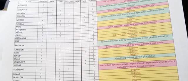 Cumhurbaşkanı Erdoğan'ın masasındaki son ankette AK Parti, CHP, MHP, İYİ Parti ve HDP'nin oy oranları ve milletvekili sayıları il il listelendi.