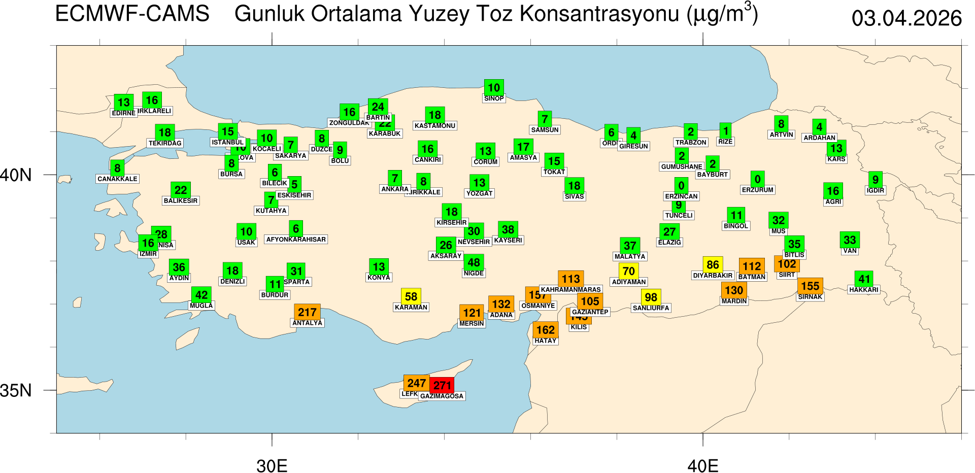 Dün yapılan uyarılar gerçeğe dönüştü ve Alanya bugün Türkiye'nin en kirli havasına uyandı. Meteorolojik haritalarda beklenen 152 µg/m³ seviyesi aşılarak yüzey toz konsantrasyonu 217 µg/m³ gibi korkutucu bir rakama ulaştı. Şehir merkezinde ve yüksek kesimlerde görüş mesafesi ciddi oranda düşerken, gökyüzünün rengi tamamen değişti.